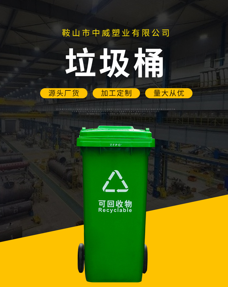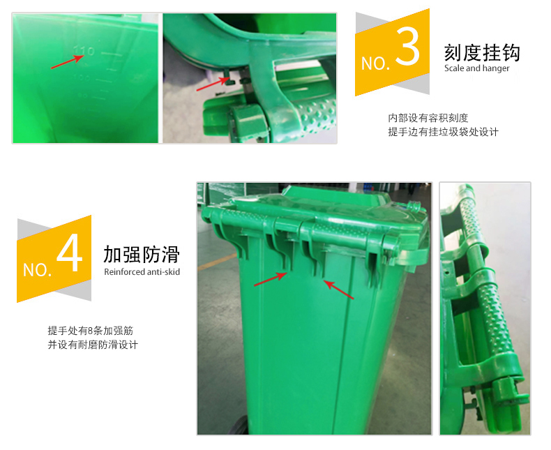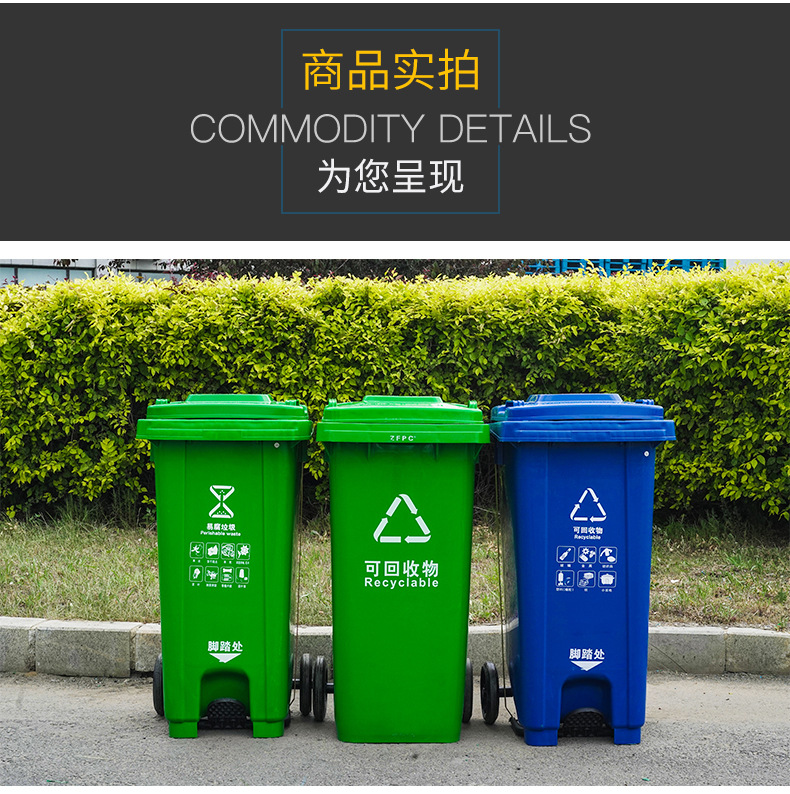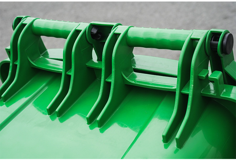 9)240L塑料垃圾桶均采用100% 高密度聚乙?。℉DPE)全新料制造,產(chǎn)品材質(zhì)注入了高質(zhì)量的占整個材質(zhì)2%以上的防曬紫外線原料和占整個材質(zhì)3%以上的顏料色素,垃圾桶具備防紫外線防老化功能,桶顏色3年保持光澤、鮮艷不褪色;輪胎采用優(yōu)質(zhì)的天然橡膠材質(zhì),輪軸采用45#中碳鋼。
