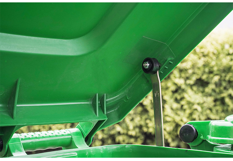 3)輪軸為插入防盜式結(jié)構(gòu),100%高密度聚乙烯HDPE原生料一次注塑成型。橡膠硬度測試達到60確保清運過程動作平穩(wěn),便于清洗。