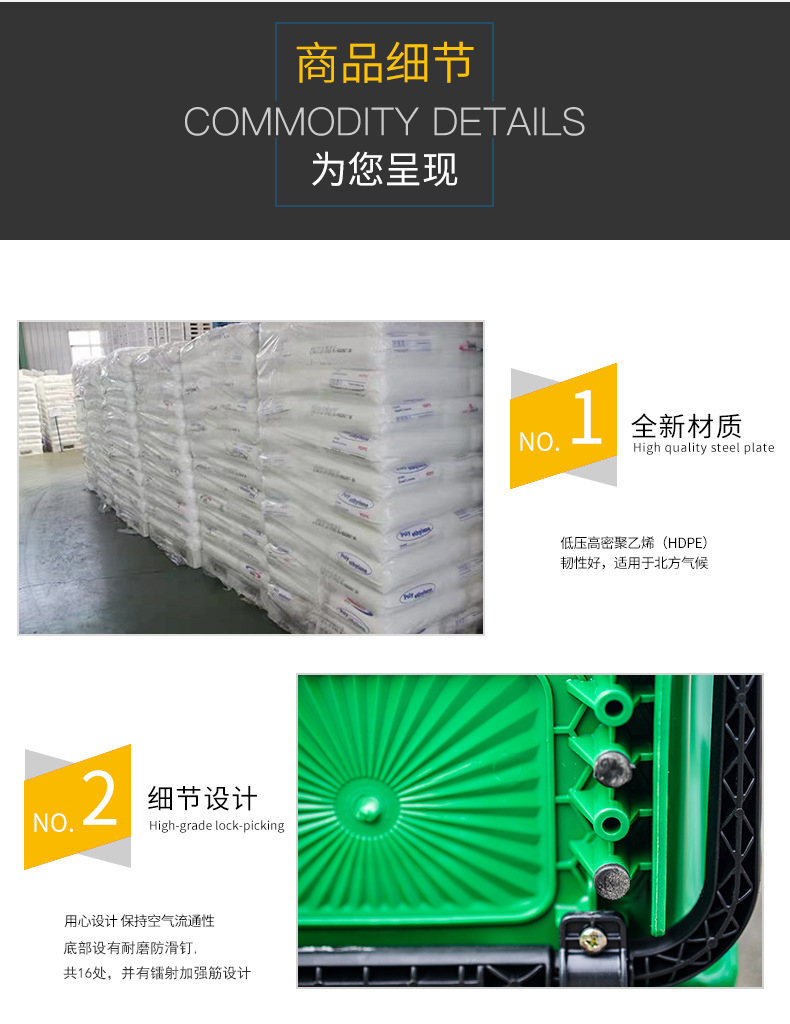 1)產(chǎn)品使用高密度聚乙烯全新料(HDPE)一次性注模成型。單蓋體重量為1.35Kg,單個通體重量大于等于10kg,橡膠輪子\連接桿采用防銹鍍鋅處理,整體重量大于15.5kg。