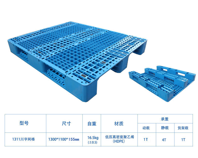 【尺寸】1300*1100*155mm 【自重】16.5kg(±0.5) 【載重】動(dòng)載1噸,靜載4噸 【材質(zhì)】PP/PE 【顏色】藍(lán)色 【鋼管】可內(nèi)置10根鋼管,加鋼管后動(dòng)載1噸,靜載4噸 【備注】川字網(wǎng)格塑料托盤能使用叉車周轉(zhuǎn)貨物,可以上貨架使用(上貨架時(shí),承載量根據(jù)貨架結(jié)構(gòu)而定,嚴(yán)禁超載使用)